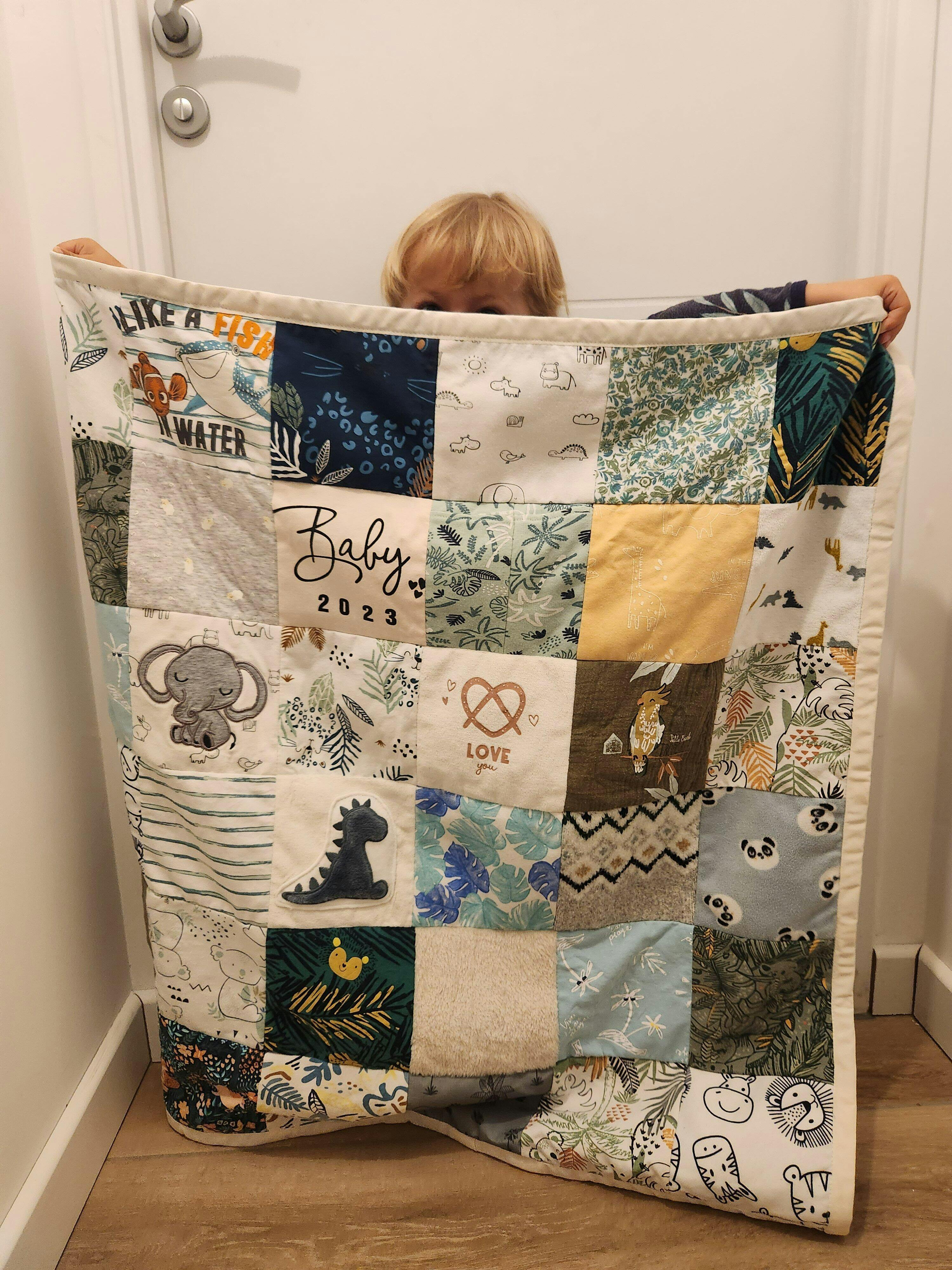 Comme son nom l’indique c’est une couverture de mon fils qui a actuellement 22 mois avec des vêtements de naissance.